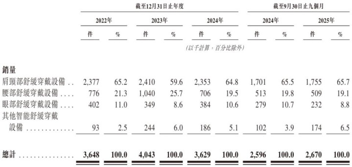 回到具体的产品营收层面,2025前三季度,公司来自智能舒缓穿戴设备的销售收入为6.3亿元,较上年同比微增0.2%。其中,作为核心产品的肩颈舒缓穿戴设备近年来销量始终徘徊在2400件左右,2025前三季度该产品的收入为3.84亿元,相较上年同比减少1.85%。